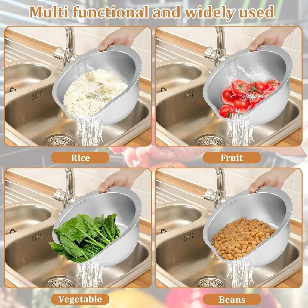 in- Stainless Steel Rice Washer & Strainer Bowl | Fine Mesh Colander with Side Drainers for Washing Rice, Quinoa, Fruits, Vegetables & Beans | Multipurpose Kitchen Tool | Silver