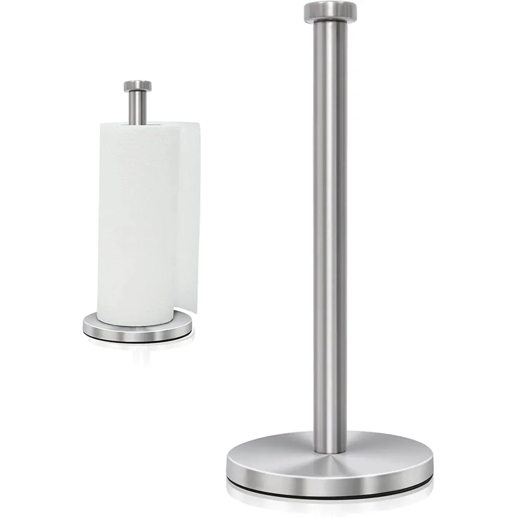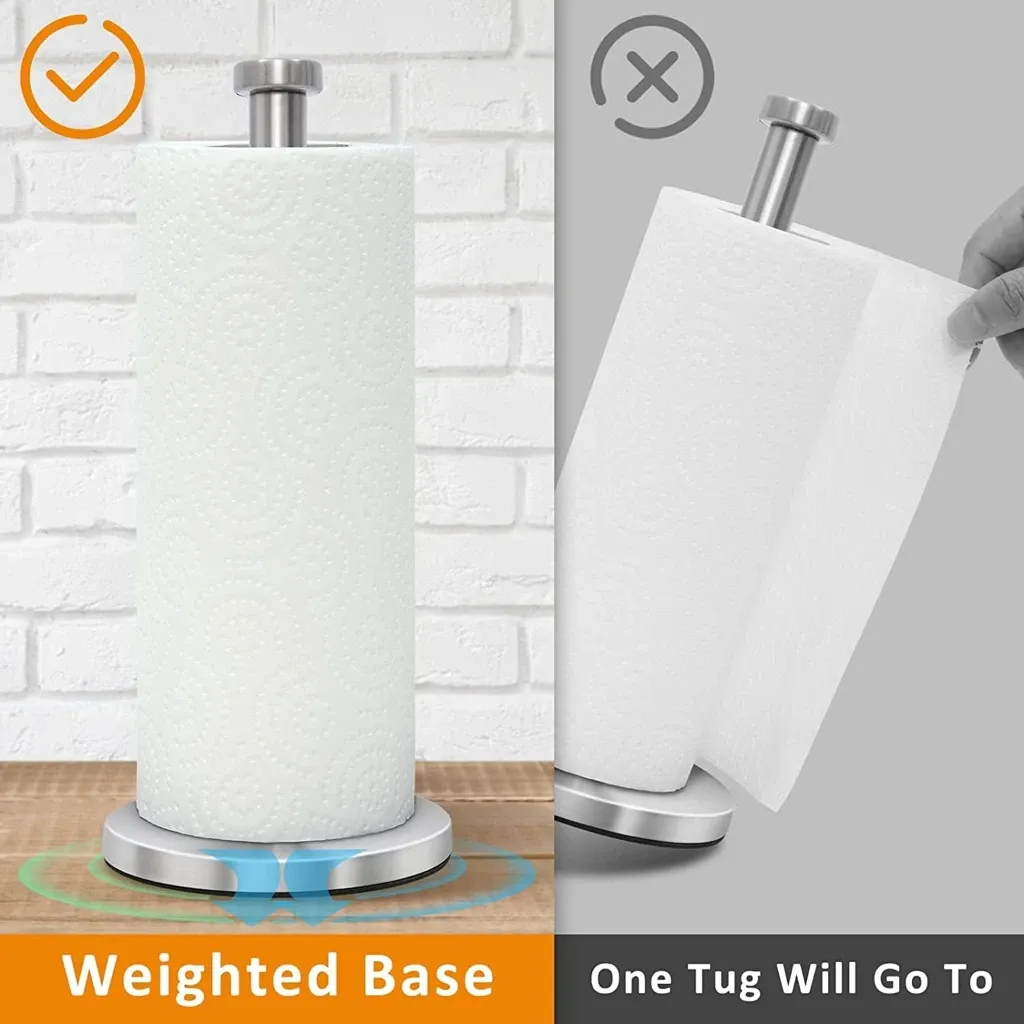 SOLID CONSTRUCTIONOur paper towel holder countertop is made using solid stainless steel construction, to ensure long life expectancy. Thanks to its padded base, placing this holder anywhere that is convenient is not a problem as you will not worry about it scratching or damaging your precious countertops. This freestanding paper towel holder and dispenser on any countertop without tipping over.